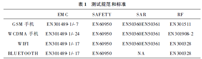 手機CE認證的測試內容有四部分,分為EMC (電磁兼容)、SAFETY (安規)、SAR (比吸收率)、RF(射頻)。每部分所對應的測試規范和標準見下,表1