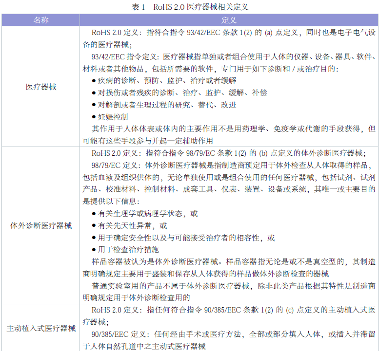 第8類監測和控制設備以及第11類其他未在10大類內的電子電氣設備,并對新納入管控的設備給予一定的緩沖期。其中醫療器械需從2014 年7 月22 日起執行相關要求,體外診斷醫療器械自2016 年7 月22日起執行,豁免主動植入式醫療器械。新指令中醫療器械相關定義見表1。