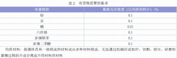 醫療器械需符合RoHS 2.0 附件II的有害物質限量要求,詳見表2。此外,企業應該了解附件II的受限物質清單并非是一成不變的。根據指令要求,歐盟委員會將對附件II 的受限物質清單進行定期審核和評估,目前首次評估項目已于2012 年11 月21 日啟動,預計歷時一年。此次評估將優先考慮REACH法規附件XVI 和附件XVII,特別是六溴環十二烷(HBCDD)、鄰苯二甲酸二(2- 乙基己基) 酯(DEHP)、鄰苯二甲酸丁芐酯(BBP)和鄰苯二甲酸二丁基酯(DBP)這四種物質