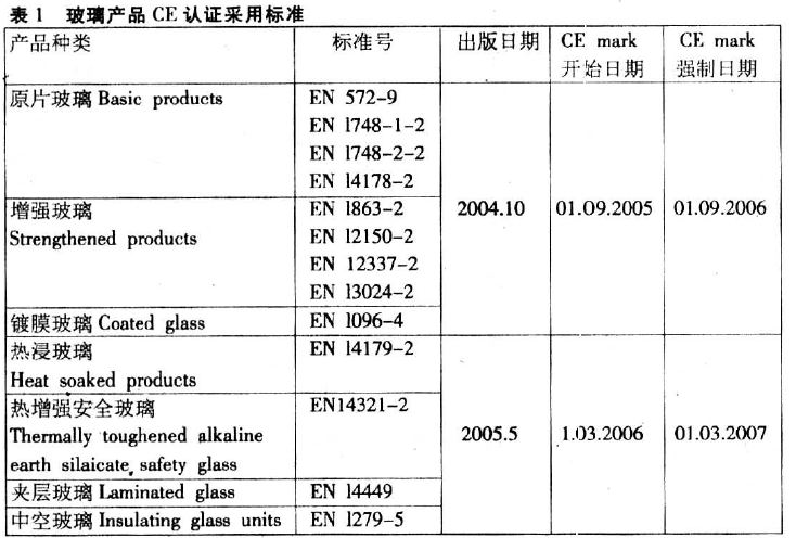 建筑玻璃CE認證采用標準有支持性標準和一致性歐洲準則(hENs)兩類,支持性標準有包括產品標準、產品特性標準、產品特性計算或測量方法標準等,這些支持性的標準由CEN 負責起草出版,CEN 標準出版后將取代所有成員國的國家標準。一致性歐洲準則(hENs)是必需強制執行的,這些準則是相應產品標準體系的一部分,通常是標準體系的最后一個部分,名稱一般為“第×部分×××產品一致性評價”(Part XEvaluation ofconformityProduct standard)。只有夾層玻璃例外,它是一個單獨的標準——“EN144492005 建筑玻璃——夾層玻璃和夾層安全玻璃——一致性評價方法”。不同玻璃產品CE 認證采用的標準,進入歐洲市場的所有建筑玻璃產品必需遵守這些標準。