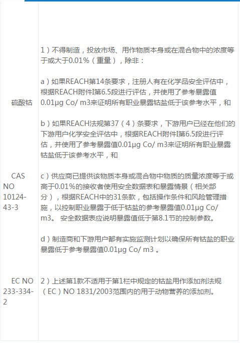 2018年10月份,ECHA提交了限制物質檔案,提議將5種鈷的化合物加入 法規限制篇。這些鈷的化合物之前已經被加入到SVHC候選物質列表,在CLP法規中被認定為致癌、致生殖毒性和皮膚、呼吸道致敏物。
